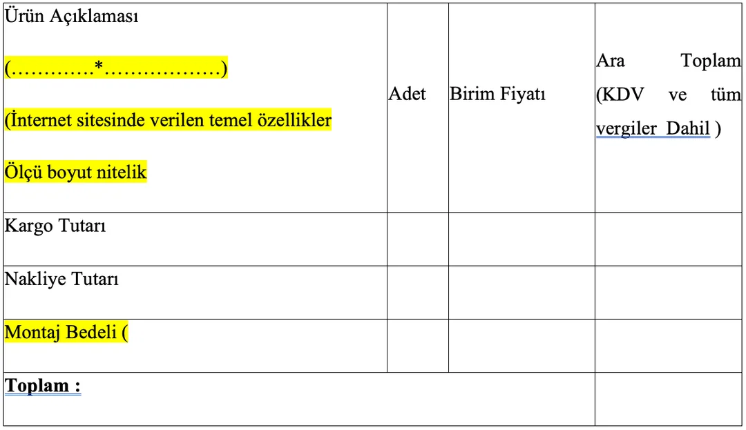 İş bu ön bilgilendirme formunu kabul etmekle ALICI, sözleşme konusu siparişi onayladığı takdirde sipariş konusu bedeli ve varsa kargo ücreti, montaj ve servis ücreti, vergi gibi belirtilen ek ücretleri ödeme yükümlülüğü altına gireceğini ve bu konuda bilgilendirildiğini kabul beyan ve taahhüt eder.